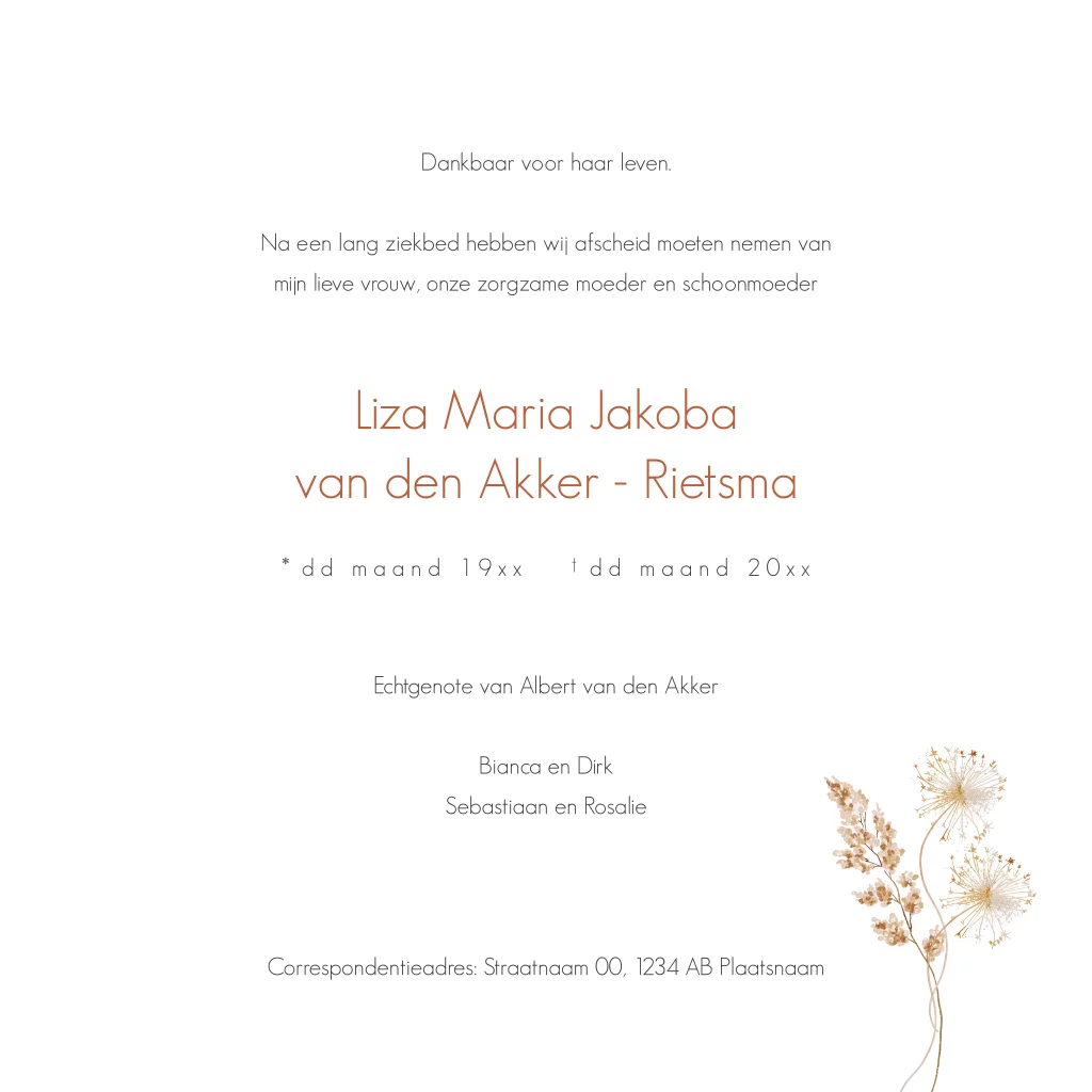 Rouwkaart een subtiel bloemenboeket van rustige kleuren in aardetinten.