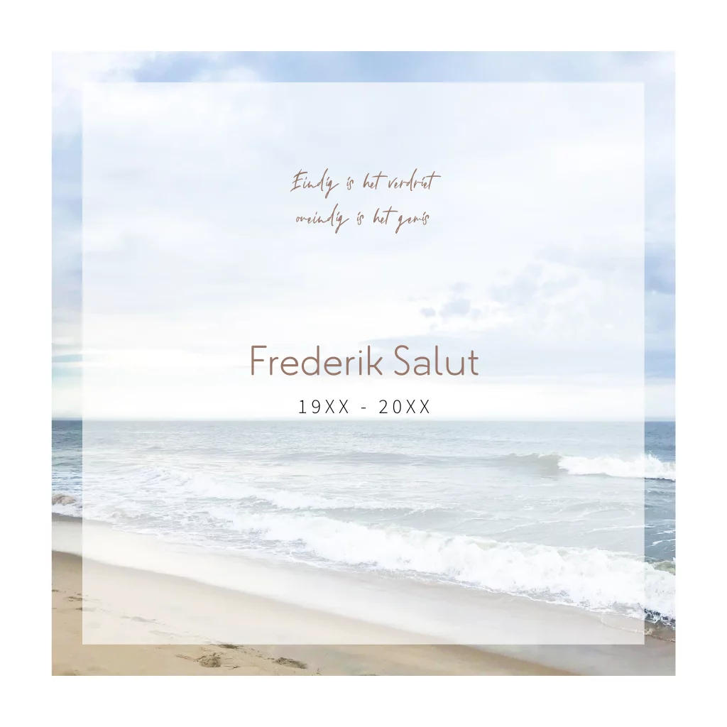 Prachtige rouwkaart met rustige, blauwe wolkenlucht, golvende zee en strand in kaders. Op de binnenzijde is ruimte voor een foto.
