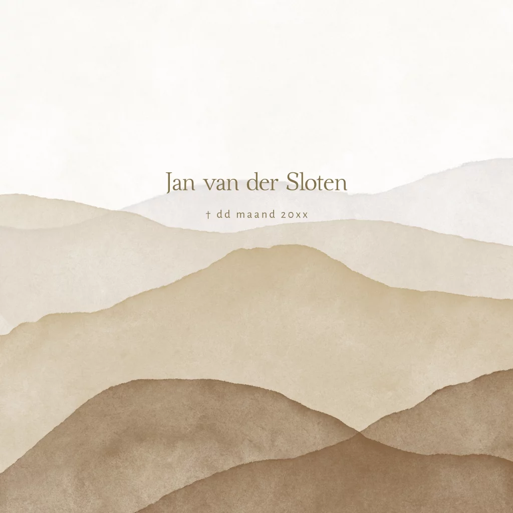 Rustige rouwkaart met een aquarel bergen. Deze kaart, ter kennisgeving van overlijden, heeft een minimalistisch design.