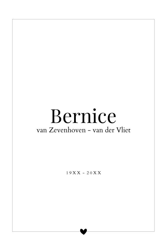 Klassieke rouwkaart met zwarte lijn rond zwarte tekst met een zwart hartje.
