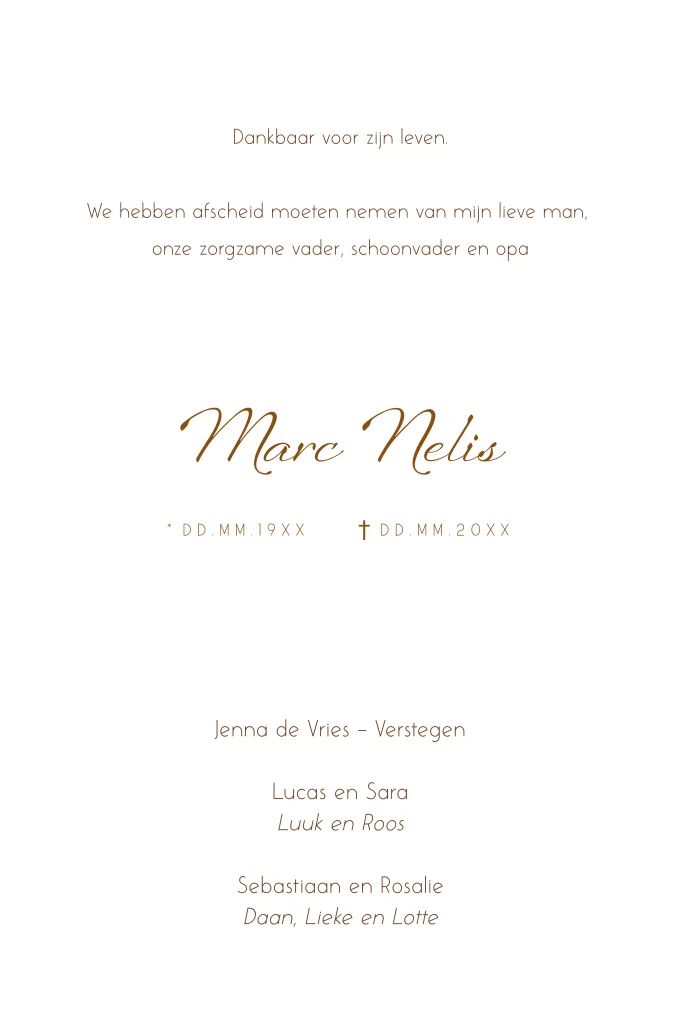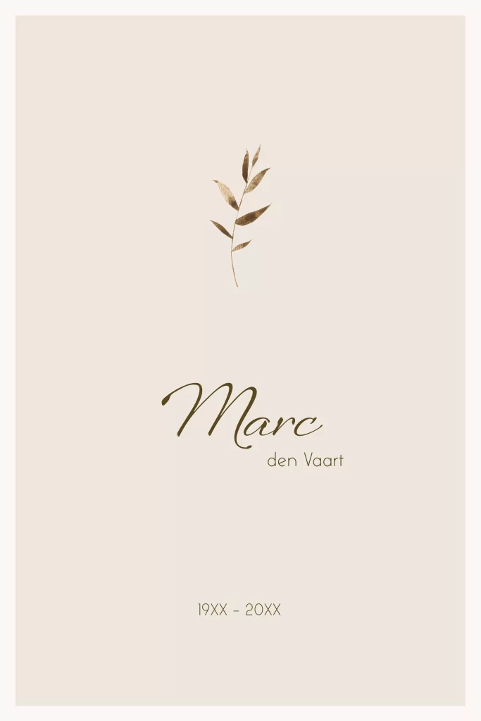 Een rustige rouwkaart met een zandkleurige achtergrond en een koper / brons takje op de voorzijde.