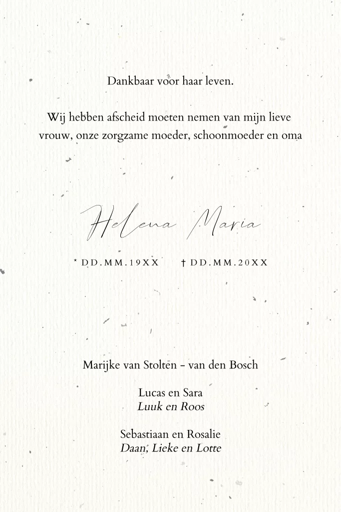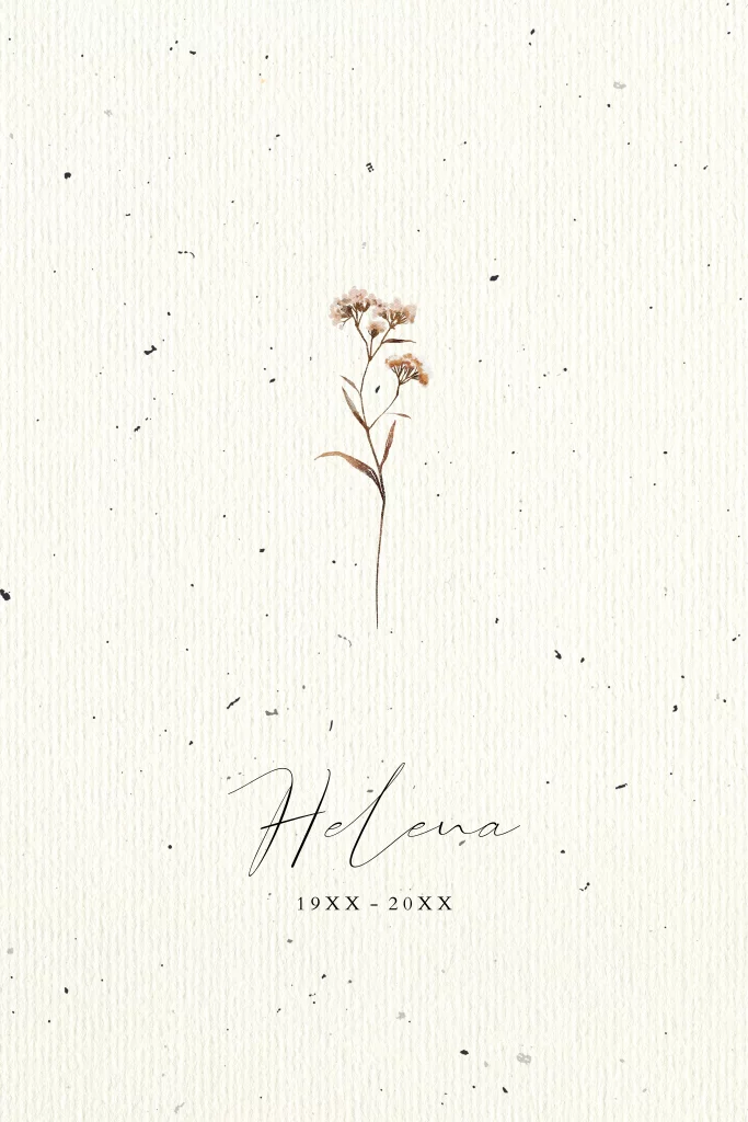 Rouwkaart met vlekjes achtergrond en een oudroze veldbloem op de voorzijde. De foto aan de binnenzijde wijzig je gemakkelijk voor een eigen foto.